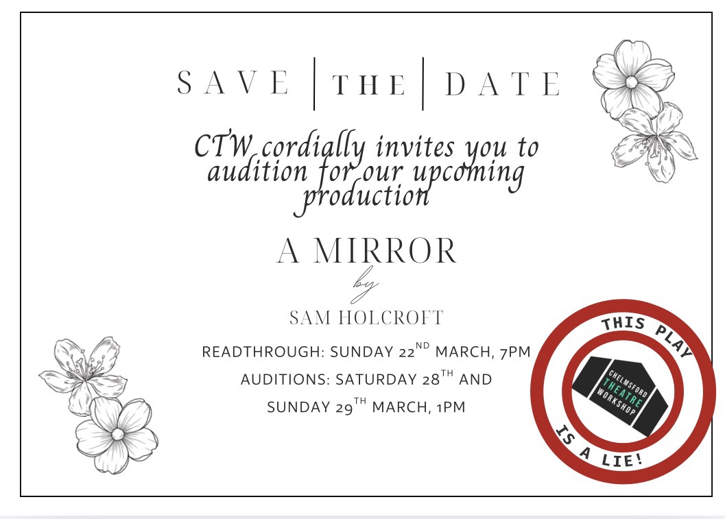 Auditions: Saturday 28th and Sunday 29th March, 1pm. If you cannot make either of these dates, get in touch to discuss potential alternatives